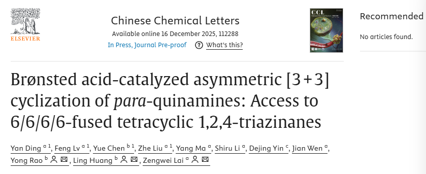 近日,2138CC太阳集团赖增伟课题组与海南大学药学院黄玲/饶勇课题组合作,在国产知名期刊《Chinese Chemical Letters》(中科院1区,IF 8.9)上发表了题为"Brønsted acid- catalyzed asymmetric [3 + 3] cyclization ofpara-quinamines:access to 6/6/6/6-fused tetracyclic 1,2,4-triazinanes"的研究论文。该研究开发了一种有机催化不对称合成策略,成功高效构建了一类具有挑战性的三维饱和氮杂环分子骨架——...
