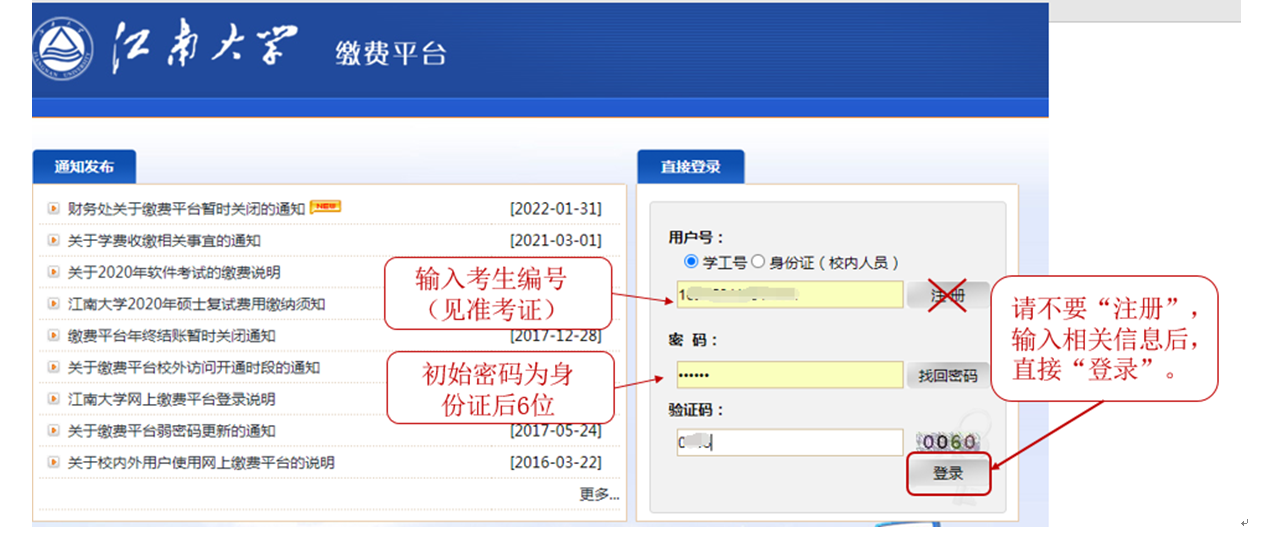 支付复试费80元(仅申请考核考生,硕博连读考生无须缴费),请不要注册,直接输入用户名及密码直接登录!登录用户名为准考证上的考生编号(请考生下载准考证查看,准考证打印系统网址:http://yzgmis.jiangnan.edu.cn/zsgl/bswb/login.aspx),初始密码为身份证号码后6位。如不能正常显示收费项目,建议更换为360浏览器兼容模式。