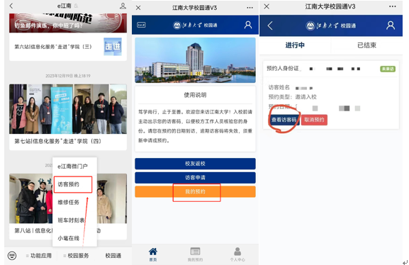 手机关注“e江南”微信公众号,点击屏幕下方“校园服务”中的“访客预约”,进入后点击“我的预约”,点击“查看访客码”即可获得访客码。进入校园时出示访客码。