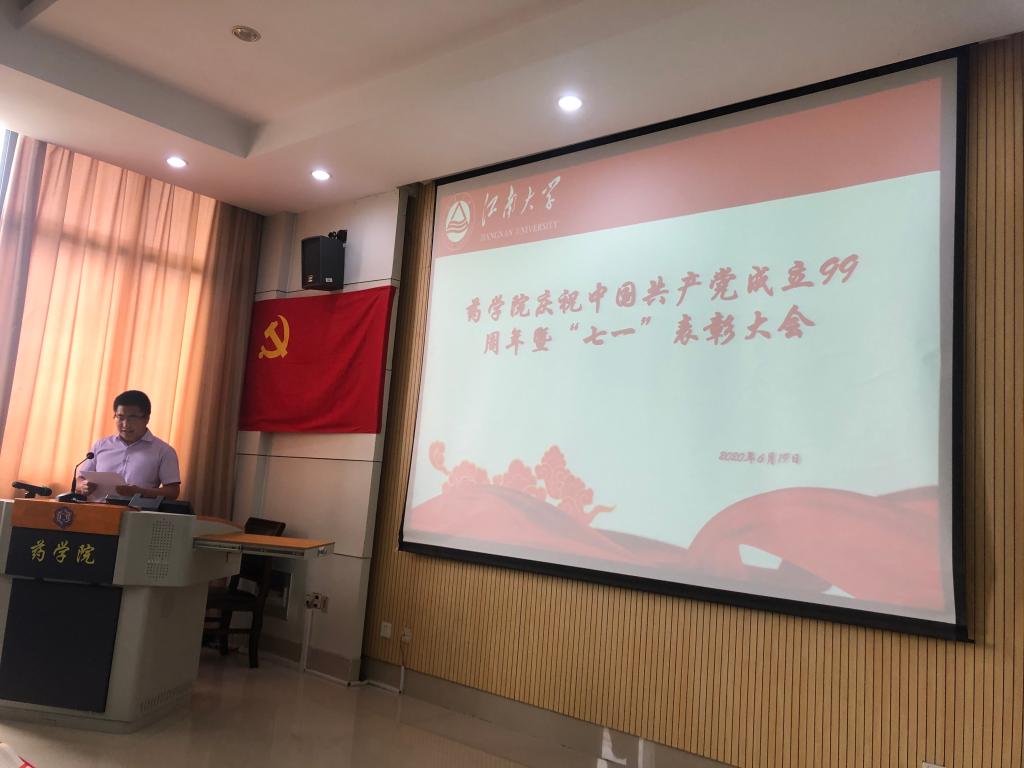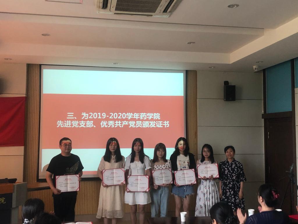 大会着重对2019-2020学年药学院“先进党支部”、“优秀共产党员”进行了表彰。经各党支部民主推荐、参照年度考核评优成绩,由党委会讨论决定,药学院教师第一党支部和研究生第一党支部荣获“先进党支部”荣誉称号,蔡燕飞、吴浩等11位师生党员获“优秀共产党员”荣誉称号。院党委书记陈霞雯和副院长李会分别为先进党支部和优秀共产党员获得者颁奖。