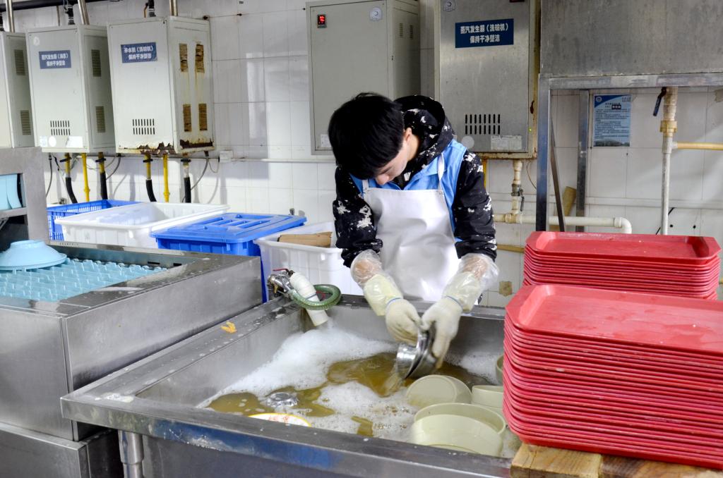 志愿者进行餐具清洁