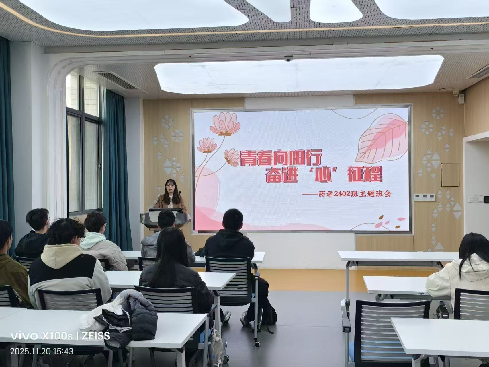 制药2502班以“做自己的英雄”为主题,通过“雨点变奏曲”“孤岛求生”“巧解千千结”等心理游戏,引导学生在协作中感受集体力量。班主任赵丽敏通过心灵疏导缓解焦虑,强调“我们永远不是孤身一人”,鼓励大家在集体中共同成长,做自己成长的英雄;药学2402班从学风、升学与心理健康三维度展开,班主任陆冁君结合学业表现引导学生端正态度,通过分享毕业去向数据引导学生明确目标,同时普及心理知识,倡导用积极的心态看待心理困扰,鼓励大家主动互助,强化班级积极氛围;制药2302班聚焦积极心态与情绪调节,班主任张纯结合实例介绍深呼吸法、蝴蝶拍、感官激活等多种易操作技巧,引导学生通过运动、书写等方式科学缓解压力;药学2202班面向大四学生开展心理疏导,班主任朱蕴韬针对考研、求职等压力,介绍校内外可以寻求帮助的心理资源,为推免、考研、求职三类学生提供针对性建议;强调“心之所向,素履以往”,鼓励学生积极应对挑战,迎接未来的“春暖花开”。