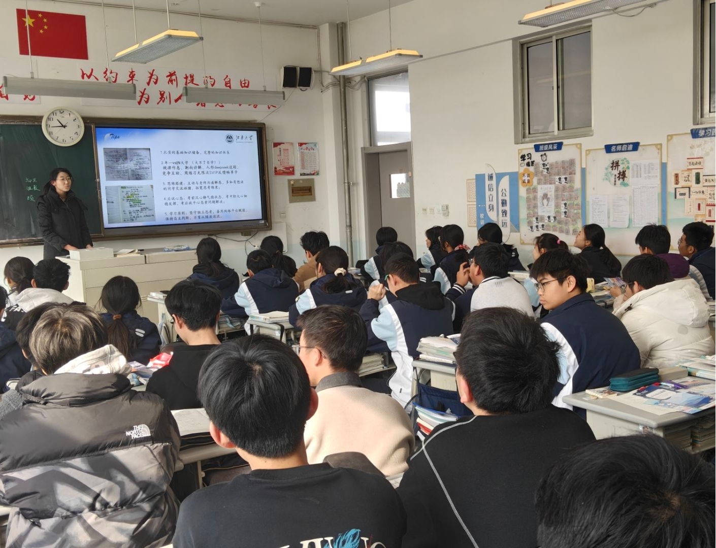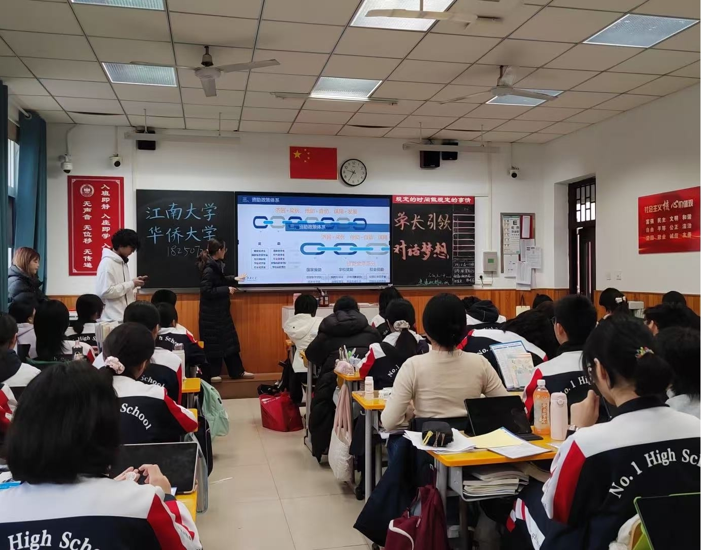 国家奖学金获得者刘焱嫣、陈俭莺走进石家庄市第一中学,面向高中学子及家长开展线下专项宣讲,精准送达资助关怀与升学指导。团队创新采用“政策讲解+亲身分享+现场答疑”形式,分层分类解读国家与校内资助政策,清晰阐释校地资助政策衔接方式,详细介绍学校为家庭经济困难学生提供的全方位帮扶保障措施。二人结合从石家庄一中备考到步入江大的成长历程,讲述在资助政策支持下安心求学、参与竞赛、融入校园的真实故事,传递自强不息的青春态度。针对“资助申请时间”“勤工助学安排”等问题,她们逐一细致解答,现场互动热烈,家校反馈良好。作为江大学子,她们更将“笃学尚行,止于至善”的校训精神融入宣讲,分享新时代大学生的成长故事。