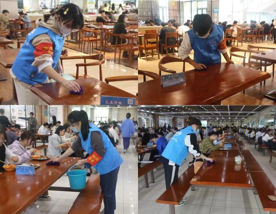 志愿者们在食堂帮助擦桌子
