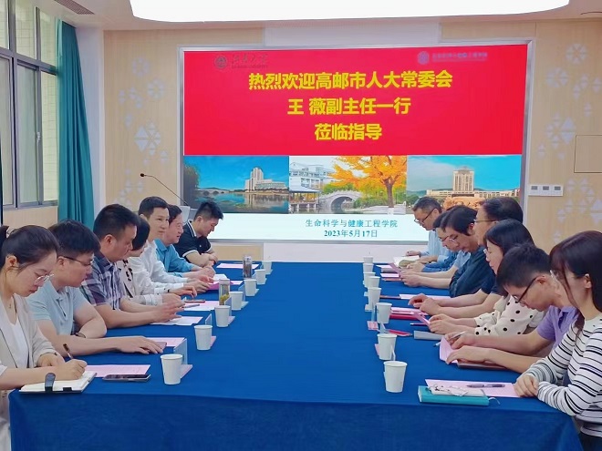 王薇对学院的热情接待表示衷心感谢,高度评价了学院在生命健康领域取得的成就。她简要介绍了高邮市地理、文化、经济、产业等基本情况,对高邮市的生命健康产业链、生物医药重点企业等进行了重点交流,希望生科院的教授们可以到高邮传经送宝,碰撞出更大的火花。杨大忠介绍了高邮市开发区的基本情况,就人才培养、人员培训、研发平台和成果转化等方面表达了强烈的需求。