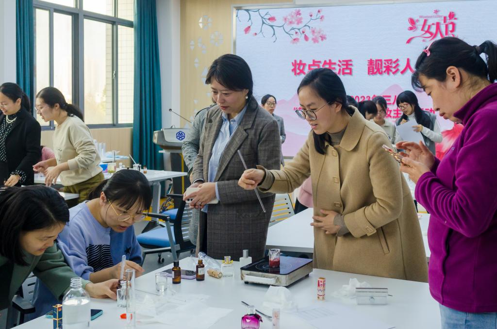 微风渐暖、花香渐浓。在生机盎然的3月,为丰富女教工精神文化生活,提高艺术修养和生活乐趣,2138CC太阳集团分工会于15日下午在学院306室组织开展了以“妆点生活 靓彩人生”为主题的“香水&口红DIY”美妆活动。活动专门邀请了化学材料与工程学院储鸿和陈凤凤两位老师进行现场指导,学院女教工积极参与其中,度过了一段欢声笑语的午后时光。