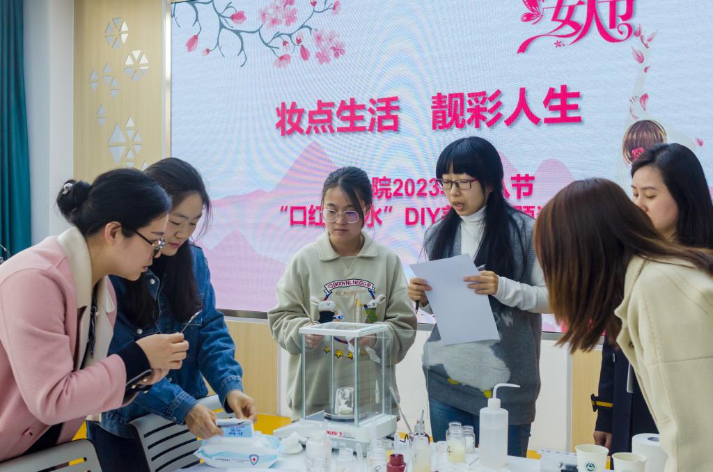 口红制作环节,在陈凤凤老师指导下,现场女教工专心致志,从称量各种原料到加热溶解,从入模脱模到成品完成,充分发挥了女教工心灵手巧的特点。在沉浸式体验了自制润唇口红的完整过程后,大家都收获了一支自己亲手制作的口红,并开心地试色、拍照,欢声笑语充盈着整个活动现场,气氛温馨活跃。当女教工们怀着期待的心情打开装罐后的口红成品时个个笑靥如花,收获了满满的幸福感。