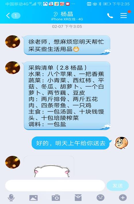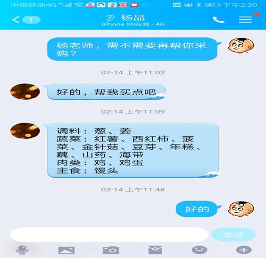 学院青年教师杨晶,她们一家2月6日下午由安徽老家返回无锡,住在学校请教公寓。2月7日上午给杨老师发了消息,下午杨老师给我发来了生活物资采购清单。我一看,嚯,还真不少!水果、蔬菜、主食、肉类、调料等近二十种。由于当天较晚了,只好第二天去采购。