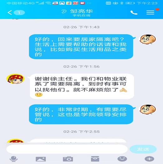 二月初,陆续有教师从外地申请返校。“疫情就是命令,防控就是责任”。为了使居家隔离的教师能安心生活,学院领导对每一位返回无锡的教师第一时间给予慰问,询问在生活方面是否需要帮助。对于需要帮助的教师,安排物资保障组落实教师的要求,使居家隔离教师能够安心生活。前后总计共给20余位教师发出帮助提示,给一位教师2次提供生活物资采购帮助。