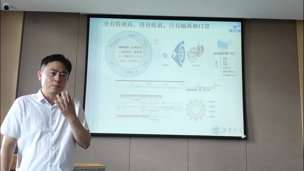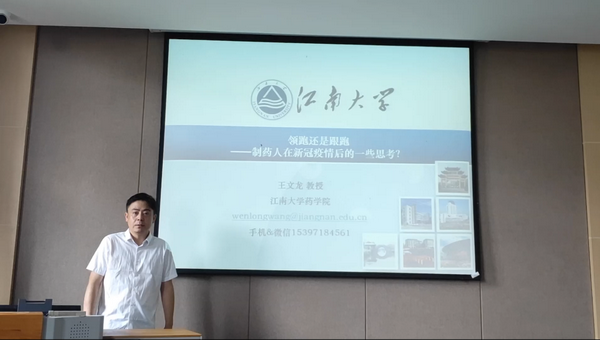 王教授围绕“领跑还是跟跑——制药人在新冠肺炎疫情后的一些思考”为主题,从年初出现的新冠肺炎疫情作为话题导入,阐述了我国对于这场突如其来的疫情所做的措施,同时讲述了国外对于疫情的应对措施,可以看出我国对于这场全人类的灾难做出了巨大的贡献。王教授从专业的角度为在场同学讲述了SARS-COV2这个病毒的相关知识与现有的对病毒的认识,使同学们对这个病毒有了更为深入的认识和了解。