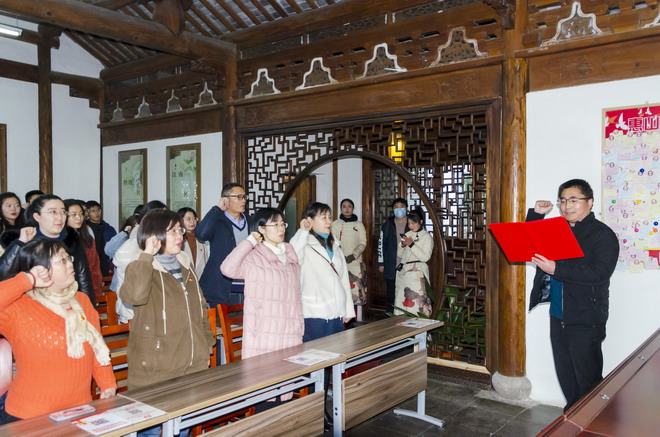 随后,全体党员来到了惠山古镇省级廉政文化教育基地会议室,观看廉政视频,体悟“不矜细行,终累大德。为山九仞,功亏一篑”的清廉道理,抄写爱莲说,分享学习感言。并在党委副书记白冰的带领下举起右手、庄严宣誓,重温入党誓词。