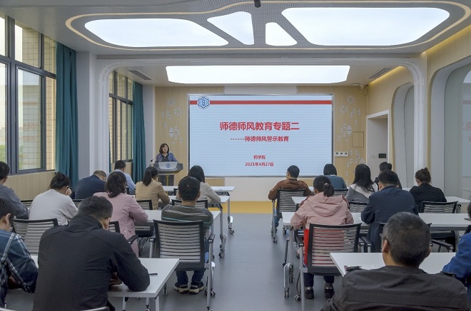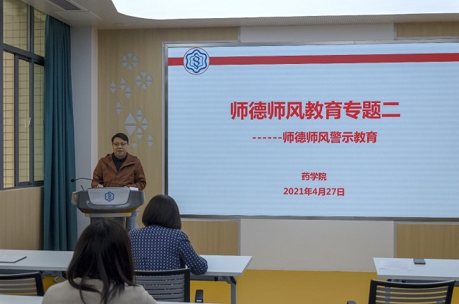 4月27日下午,药学院举行教职工师德师风第二次专题教育,会议由党委书记陈霞雯主持,药学院全体教职工参加会议。