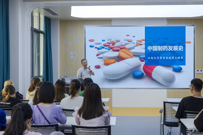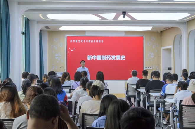 6月2日下午,药学院金坚教授以“新中国制药发展史”为主题,为2018级、2019级本科生讲授“形势与政策”课程,也是药学院党史学习教育的系列报告之一。报告由药学院党委副书记白冰主持。