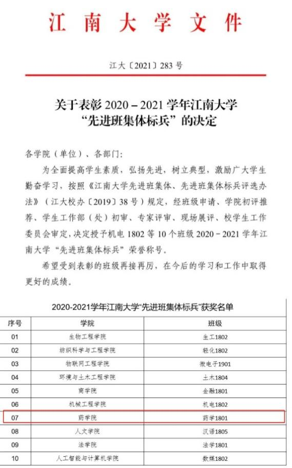 在江南,有这样一个班级,它是2138cc太阳集团首届药学班,也是学院首个院长担任班主任的班级,更是学校首个由院士亲自授旗的特称团支部。近期,该班又勇夺2138cc太阳集团2020-2021学年“先进班集体标兵”荣誉,它就是“药学1801班”,接下来,让我们一起回顾一下这个神仙班级在新“药”发布会上的夺“标”记吧。