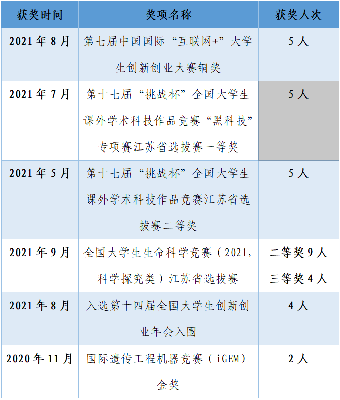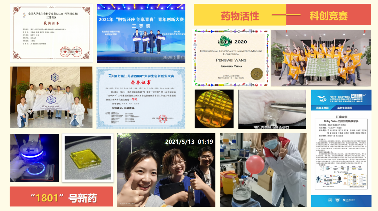药学1801班时刻践行秦伯益院士引领的“科学家精神”,将敢为人先的榜样示范精神贯彻到底。全班大创参与率94%,4人参加国家级大创,目前累计共有11人次在不同领域的核心期刊发表文章。班级超50%人参与科研竞赛,获得“国际遗传工程机器竞赛”金奖、“互联网+”国赛铜奖、“挑战杯‘黑科技’专项”省一等奖、“全国大学生生命科学竞赛”省二等奖,共计获得国际奖项2人次、国家级奖项5人次、省级奖项28人次。