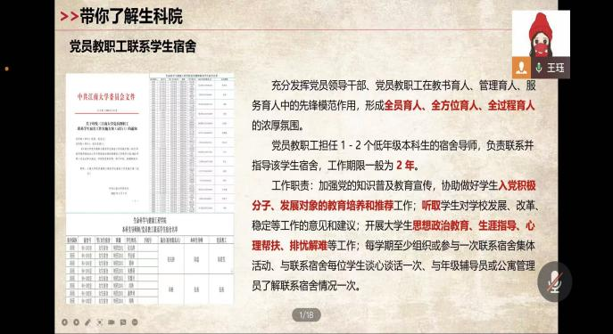 党员教师通过线上+线下双阵地,课内+课外双平台,搭建起与学生沟通的桥梁。老师们积极走进寝室和学生交流,对同学们封校期间的学习生活表示关心,勉励大家志存高远,力求上进,努力实现大学期间的自我全面发展;积极构建和谐宿舍,鼓励室友之间相互关心、共同进步;为贫困学生提供物质上、精神上的帮扶与关心,引导贫困学生自立自强、树立自信心与进取心。