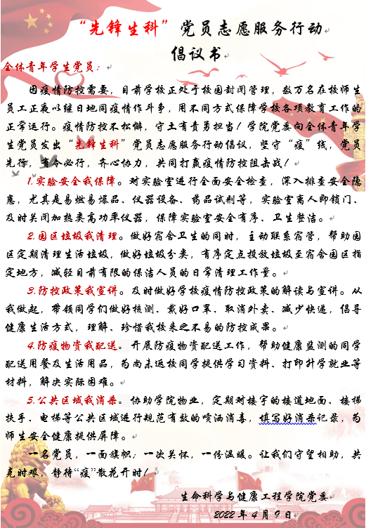 接着,蒋艳向全体学生党员发出《“先锋生科”党员志愿服务行动倡议书》。校园疫情防控是当前疫情防控工作的重中之重,数万名在校师生员工正夜以继日地同疫情作斗争,用不同方式保障学校各项教育工作的正常运行,全力确保师生安全健康。学院党委向全体青年学生党员发出倡议,号召党员先行,坚守“疫”线,守望相助,齐心协力,共同打赢疫情防控阻击战!