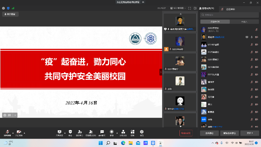 会议伊始,蒋艳介绍了本期入党积极分子培训班的计划内容与要求。她以《“疫”起奋进 勠力同心,共同守护安全美丽校园》为主题,以学校学院各条线师生员工夜以继日的防疫工作与保障运行为生动实例,结合学校最新的疫情防控政策和学校封闭管理的各项措施,号召积极分子要以身作则,充分认识到校园疫情防控的重要性,带头并带动身边同学严格遵守校内防疫要求,理解珍惜来之不易的校园防疫成果。她强调要关注自身及同学的身心健康,倡导健康生活方式,提高线上听课效率,老师不能进校的情况下,尤其要加强实验室安全,“疫”起奋进,才能“疫”往无前。