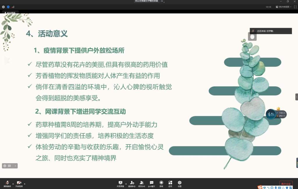 会议伊始,任老师首先介绍了本次药草种植活动的背景,指出网课学习模式减少了师生同学之间的沟通交流和接触自然的机会,芳香植物对人体生理和心理健康有积极作用,希望通过此次药草种植活动,能够让同学们走出网络和寝室,亲近自然,感悟生命的意义。紧接着任老师就活动流程、活动前期准备向同学们进行了简要说明介绍,同时强调本次活动意义在于为同学们提供户外放松场所、增进同学交流互动、提高情感协调年内、体验生命珍贵美好,最后从地点,专业和队伍的保障方面进行了说明。