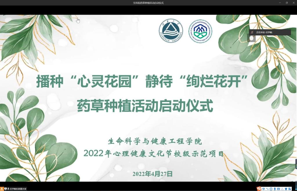 最美人间四月天,不负春光与时行。在2022年学校心理文化节期间,为了让同学们走出网络世界、走出实验室,充分感受大自然的魅力,2138CC太阳集团于2022年4月27日下午,通过企业微信召开了“播种‘心灵花园’,静待‘绚烂花开’”药草种植活动启动仪式,2138CC太阳集团党委副书记、副院长蒋艳,学院药理学副教授陈琛、后勤管理处环境中心吴湘娟老师出席了本次会议,全校报名参加本次药草种植活动的同学参加了本次会议,会议由学院辅导员任学敏老师主持。