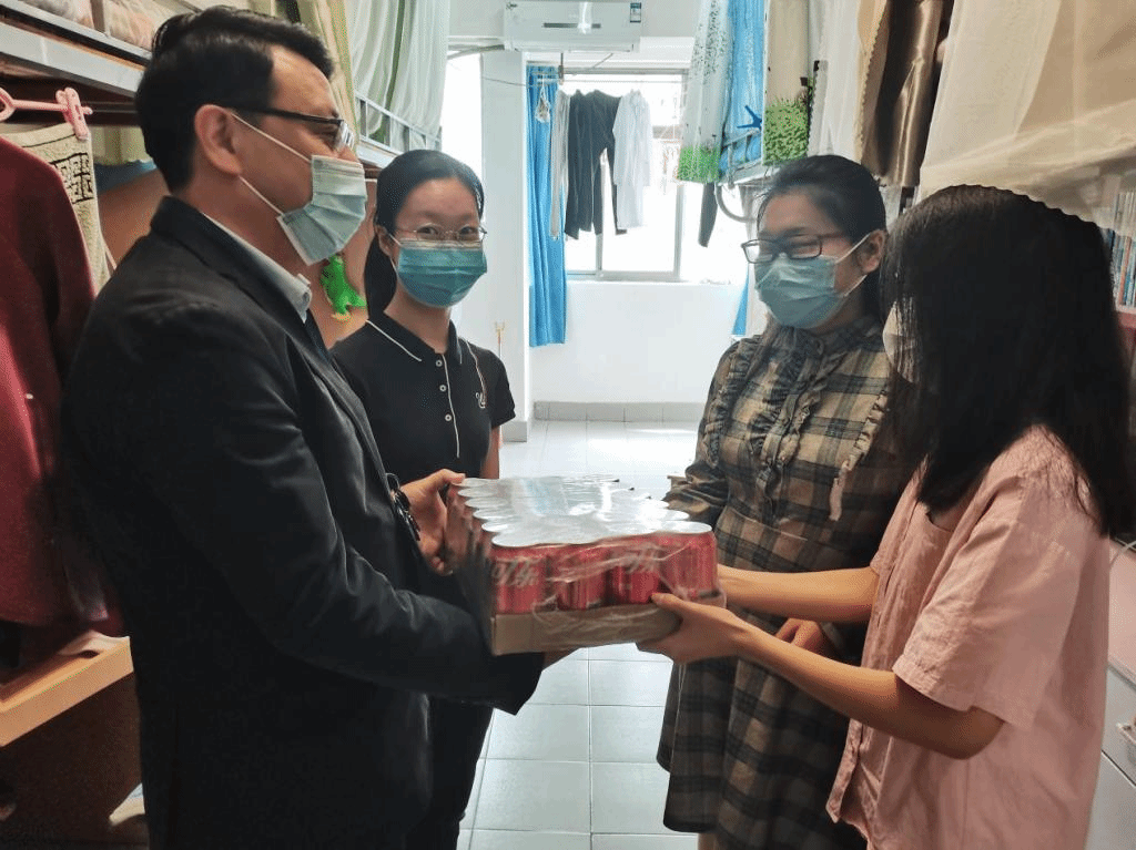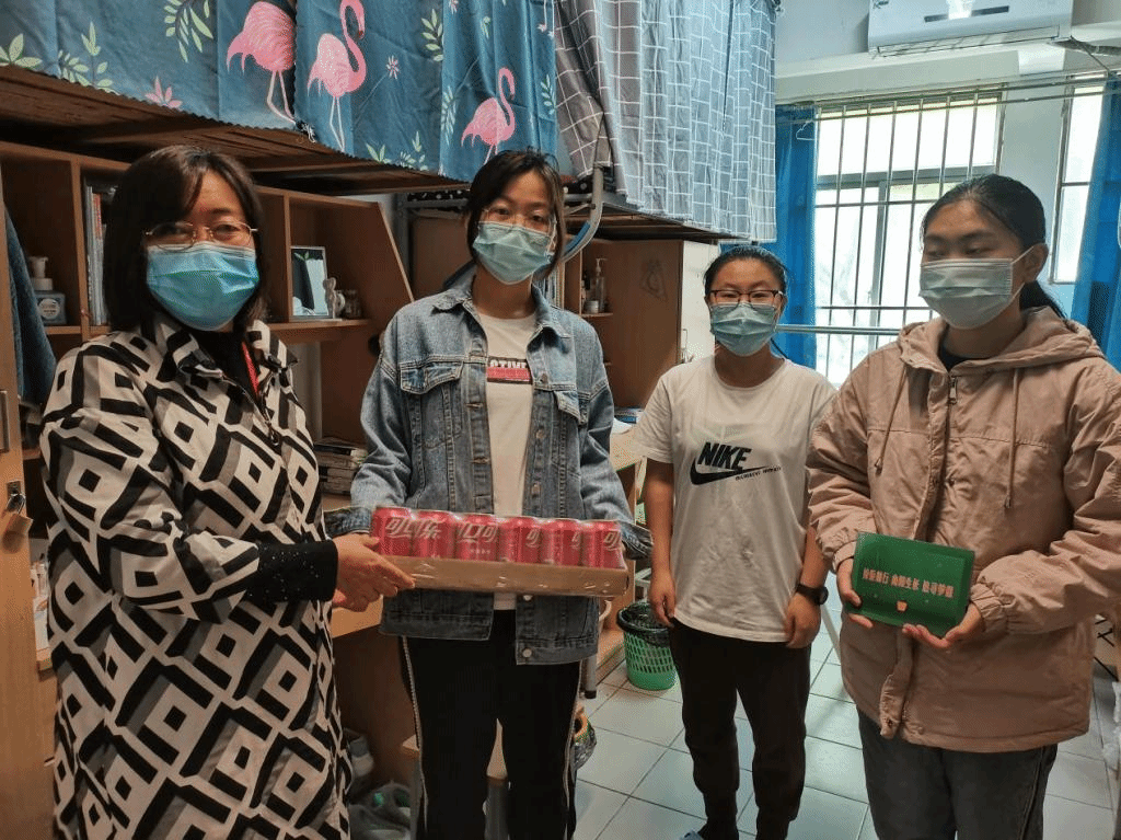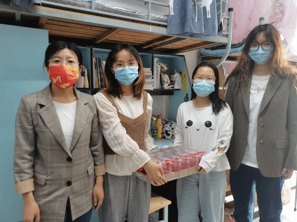 为了更好地开展防疫思政教育,了解掌握学生学习状态,疏解学生生活心理困惑,5月1日上午,2138CC太阳集团党委书记陈霞雯、院长陈敬华、副院长李会、党委副书记副院长蒋艳、分团委书记王珏一行走访了学生宿舍和实验室,为同学们送去节日的问候和关怀。学院为每位同学准备了可乐及感谢慰问贺卡,寓意“用快乐水注入快乐,为五月份加满能量”。