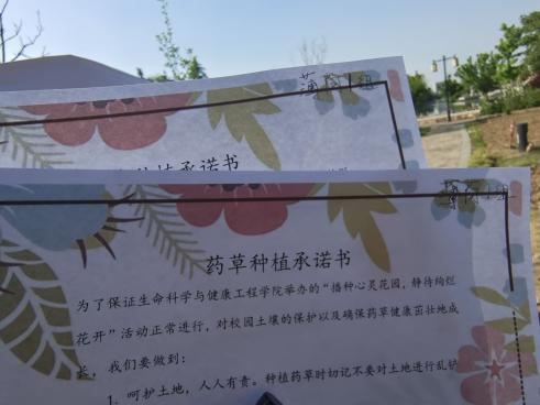 活动开始,参与本次活动的同学们和蒋书记以及吴湘娟老师首先进行合照留念,记录下同学们在百草园的首次线下会面。随后,在志愿者的组织下各“药草种植小分队”签署《种植承诺书》并有序领取《药草养护指南卡片》,种植工具以及“药草宝宝”,在指定的种植区域开启种植。