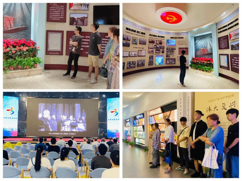 6月24日下午,实践团在学院党委副书记兼副院长蒋艳、分团委书记王珏、关工委老同志詹鲁老师带领下走进滨湖区党建馆,以中国共产党红色精神为主线,通过参观起航、星火、烽烟、黎明、奋斗等8个展厅,深入了解红船精神、井冈山精神、延安精神、西柏坡精神、红旗渠精神、载人航天精神等35个中国共产党在不同时期形成的伟大精神。一组组详实的史料、一幅幅真实的照片展示了中国共产党波澜壮阔的历史,在场的师生都被中国共产党带领中华民族团结奋斗、不断进取的历史功绩,和老一辈革命家在革命斗争、改革发展中表现出的牺牲奉献精神所深深感动。最后,全体师生向革命先烈敬献鲜花,通过对革命先烈的缅怀,感悟烈士精神,凝聚初心和信念。