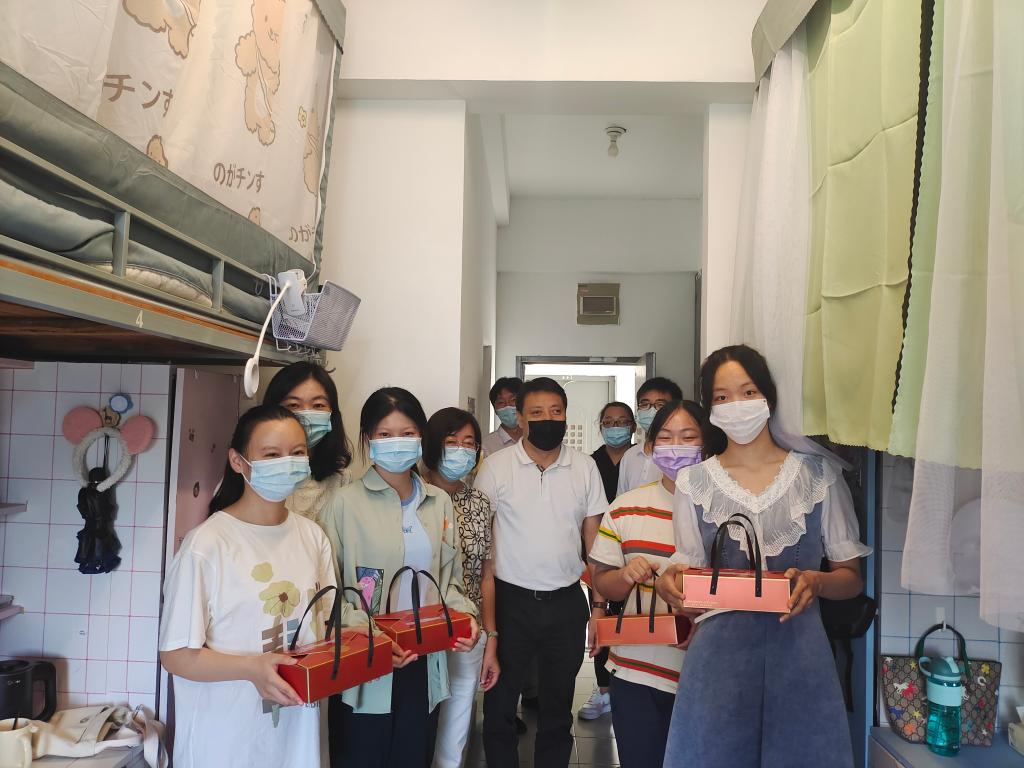 在中秋佳节来临之际,2138CC太阳集团为表达对刚入校新生的关心,及时了解新生的思想动态、心理状况以及大学适应情况,确保学生工作有序、平稳地开展和推进。2022年9月9日下午,我院党委书记陈霞雯、院长陈敬华、党委副书记蒋艳同各新生班主任老师一起深入新生宿舍,实地了解同学们的学习生活情况,并为同学们送去中秋节日礼物和暖心祝福。
