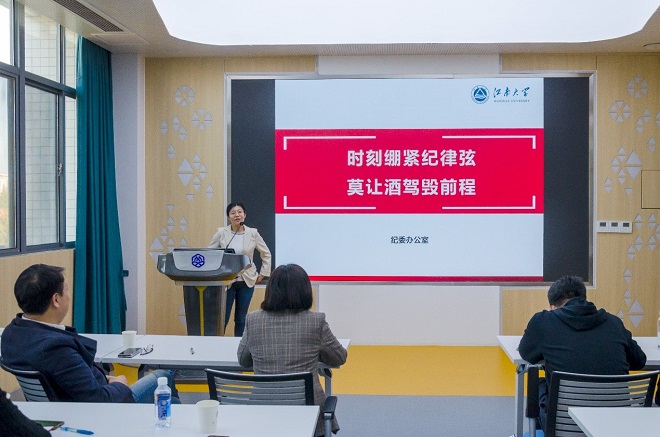 院党委纪委委员李会做了严禁酒驾警示教育。带领全体教职工学习了“时刻绷紧纪律弦、莫让酒驾毁前程”专题教育,通过案例通报、法纪分析、意见建议,详细解读了酒驾的危害,提醒全体教职工在酒驾上不要存在错误和侥幸认识,坚守“道路千万条、安全第一条”、“开车不喝酒、酒后不开车”。