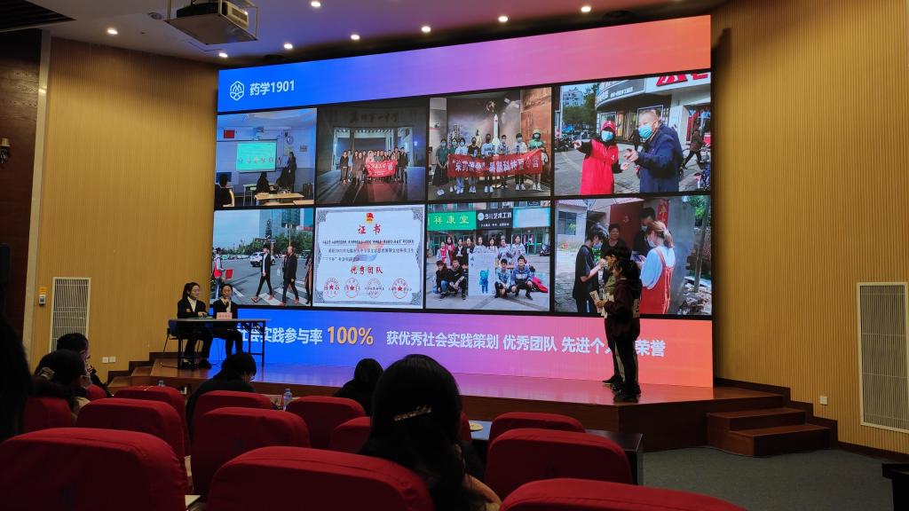 经班级申请、学院初评推荐、学生工作处初审、班级展评答辩,药学1901班以“盛科集团2023校园招聘会”为展示场景,孙莹、徐欣蕊、谢雨思等5位同学代表班级登台展示。参赛视频中,实验室主任徐欣蕊介绍了药学1901号新药的构成,将31位同学比作主药的31种“有效成分”,将学习比作“填充剂”,将学科竞赛比作“粘合剂”,将班团活动比作“润滑剂”,阐述了药学1901号新药的研发历程,激起了三位“毕业生”的求职兴趣。面对“毕业生”们的感叹和询问,两位“盛科集团HR”将优质新药在学业、竞赛、思想、志愿、实践等方面的亮点娓娓道来,互动生动幽默,将现场气氛推向了高潮。