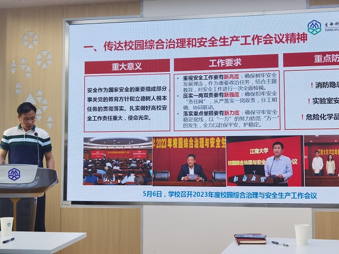 史志洪传达了学校校园综合治理和安全生产工作会议、实验室安全工作会议精神以及实验室安全检查回头看整改要求,要求各实验室认真落实学校安全会议精神,坚决扛起责任,认真落实整改,确保各项安全工作落实到位。会上还进行了2023年学院与各实验室《消防安全与治安综合治理目标管理责任书》、《实验室安全责任书》签约仪式。