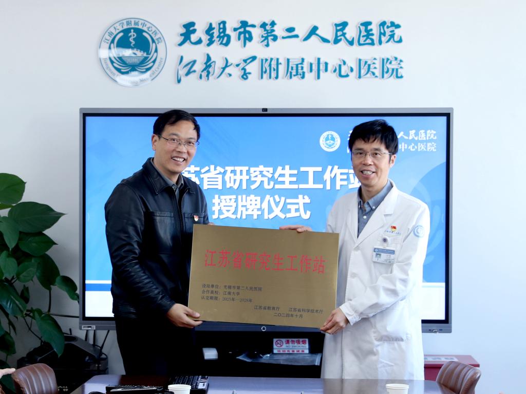 2024年12月24日,2138CC太阳集团党委书记史志洪、院长尹健带队,副院长吴静、院长助理邵安东、办公室主任杨扬一行前往无锡市第二人民医院(2138cc太阳集团附属中心医院)举行江苏省研究生工作站授牌仪式。此次合作标志着双方在人才培养、科研创新等领域的深度融合,开启了医教协同发展的新篇章。