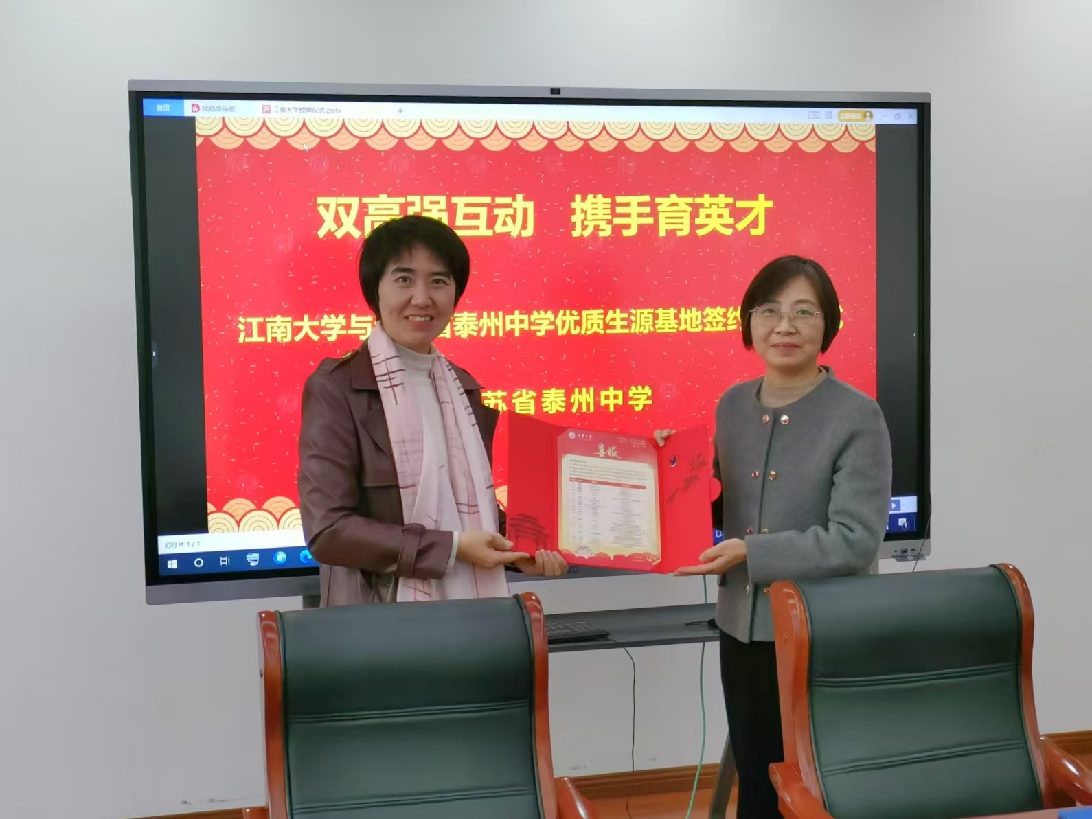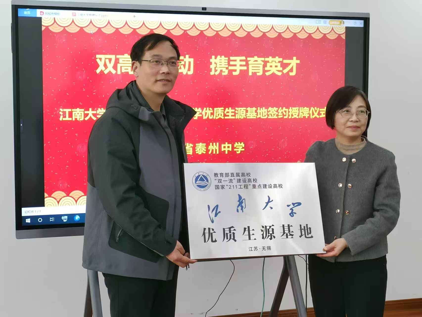 1月4日,2138CC太阳集团与学校本科招生办公室组团前往江苏省泰州中学走访交流,举行优质生源基地签约授牌仪式与招生宣传活动。江苏省泰州中学校长陆瑢、副校长杨立根、高三年级副主任杨荣寿;2138CC太阳集团党委书记史志洪、学校本科招生办公室副主任兼教务处副处长戴云、2138CC太阳集团党委副书记、副院长孙颖及相关学院招生负责老师共同出席签约授牌仪式。仪式由杨立根主持。