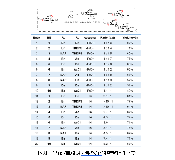 近日,2138cc太阳集团朱蕴韬教授课题组在中科院一区期刊Chinese Journal of Chemistry上发表了题为“Synthesis of Heparan Sulfate Backbone Oligosaccharides by Directly Installing cis-Linkages on Solid-Phase”的研究工作。本研究成功制备了一个包含九种硫酸乙酰肝素骨架寡糖的化合物库,其中GlcN、GlcA和IdoA之间的顺式糖苷键均在固相中构建(图2)。作者首先在液相中对十种具有不同C3-OH和C6-OH保护基组合的2-叠氮-2-脱氧硫代吡喃葡萄糖苷进行了糖基化条件探索。该研究发现,C6-OH位含有TBDPS保护基的硫代吡喃葡萄糖苷在构建GlcN与GlcA/ IdoA之间的α-1,4糖苷键时为最适供体。此外,根据团队先前的研究,在具有C2-OBn的葡萄糖硫苷进行糖基化时,3,6-位酯化可显著促进顺式选择性(J. Am. Chem. Soc.2021,143, 9758–9768)。本研究中砌块9和10 (图3)的结果进一步证实了这一结论。