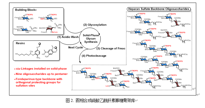 固相聚糖合成(Solid-phase glycan synthesis, SPGS)是制备结构明确聚糖的一种高效技术,它能显著简化聚糖组装过程中间产物的纯化步骤。自2001年实现自动化聚糖组装(Automated Glycan Assembly, AGA)以来(Science2001,291, 1523-1527),过去二十年间已有多种具有不同生物学功能的聚糖通过该方法成功制备,包括具有反式糖苷键连接的糖胺聚糖,如硫酸软骨素、硫酸皮肤素和硫酸角质素。然而,在固相上构建含多个顺式糖苷键的聚糖仍是一项具有挑战性的工作,因为在链延伸过程中无法分离立体异构体。目前仅有少数关于固相组装含多个顺式糖苷键聚糖的报道。对于HS,由于葡萄糖胺和糖醛酸结构单元的反应活性较低,其固相合成面临更大挑战,需要同时解决反应活性与立体选择性问题。
