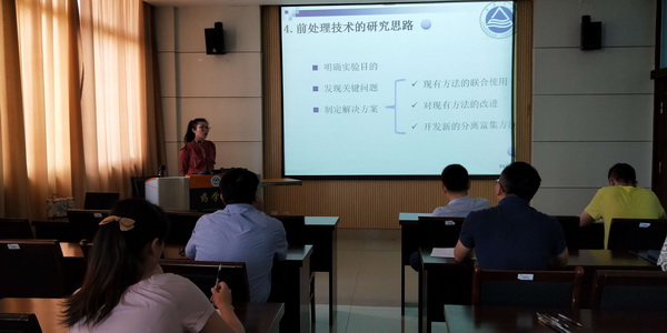 本次报告杨博士与大家分享了自己的研究课题,并围绕蛋白质及多肽定量分析中的前处理技术这一课题,系统阐述了研究该课题的必要性、常用方法、应用示例及研究思路。报告内容详实,思路清晰,引起了师生的广泛兴趣。