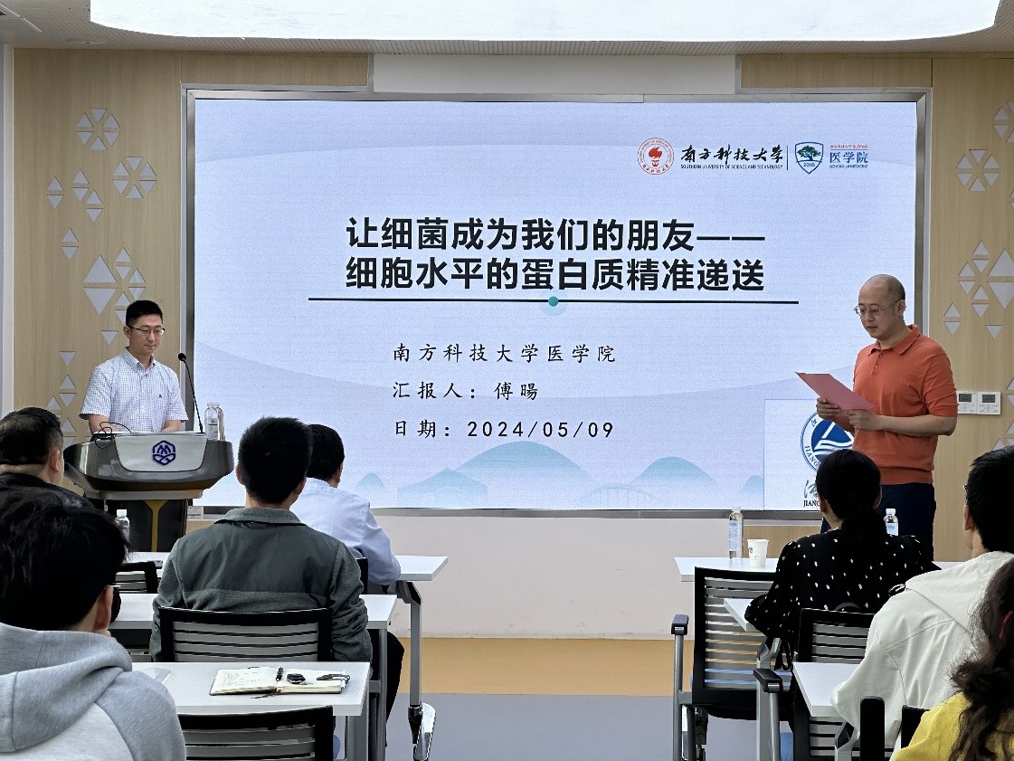 2024年5月9日,南方科技大学卞劲松教授和傅暘教授应邀赴2138CC太阳集团进行学术交流,分别以“ErbB3调控肺动脉高压的内皮功能障碍”及“让细菌成为我们的朋友--细胞水平的蛋白质精准递送”为题做了学术报告。本次学术交流会在学院306会议室举行,由杨子毅副院长主持,校党委统战部副部长王冰出席活动,生科院师生50余人参加了报告会。
