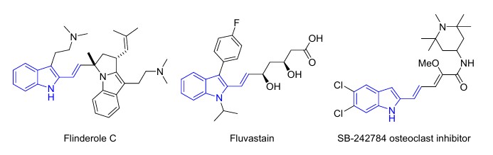 吲哚类化合物,是一类重要的含N杂环化合物,因其独特的生物活性和化学性质,广泛应用于药物合成、荧光染料、有机材料等领域。2-烯烃吲哚母核,是常见的活性药物分子的组成部分,如Flinderole C、Fluvastain和SB-242784破骨细胞抑制剂等。关于2-烯烃吲哚的合成,常见的方法是通过吲哚的直接官能团化,或是采用过渡金属催化。这些方法存在使用昂贵的金属催化剂、原料不易获得、底物范围窄等缺陷。