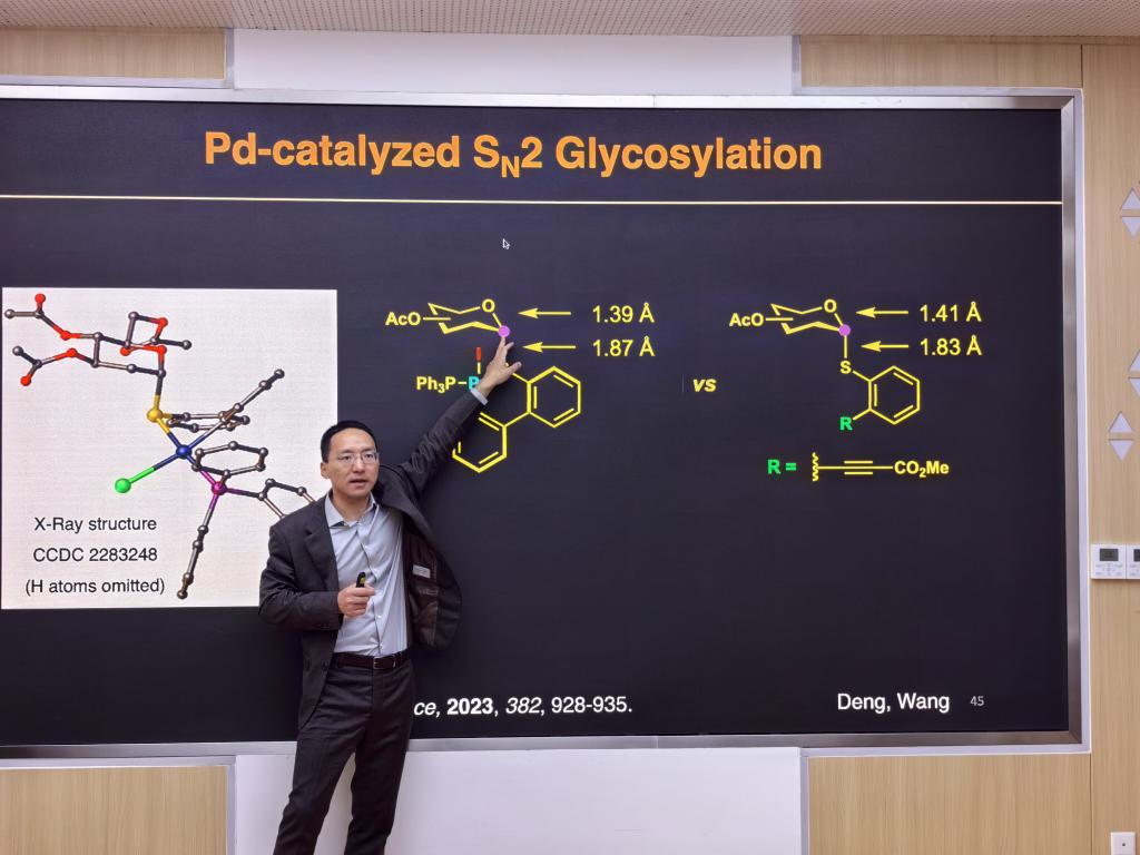 报告伊始,钮教授从糖分子生物学功能的重要性切入,结合课题组的前沿研究成果,展示了O-糖基化的新型策略。而后,结合实际案例重点探讨了非保护基糖基化的可能性;分析了不同反应选择性结果的理论基础,并利用密度泛函理论(DFT)计算验证了糖基化过程中的选择性机制。此外,他还展示了“Site-divergent Glycosylation”(位点选择性糖基化)的创新性催化设计,为复杂多糖合成提供了更多可能。