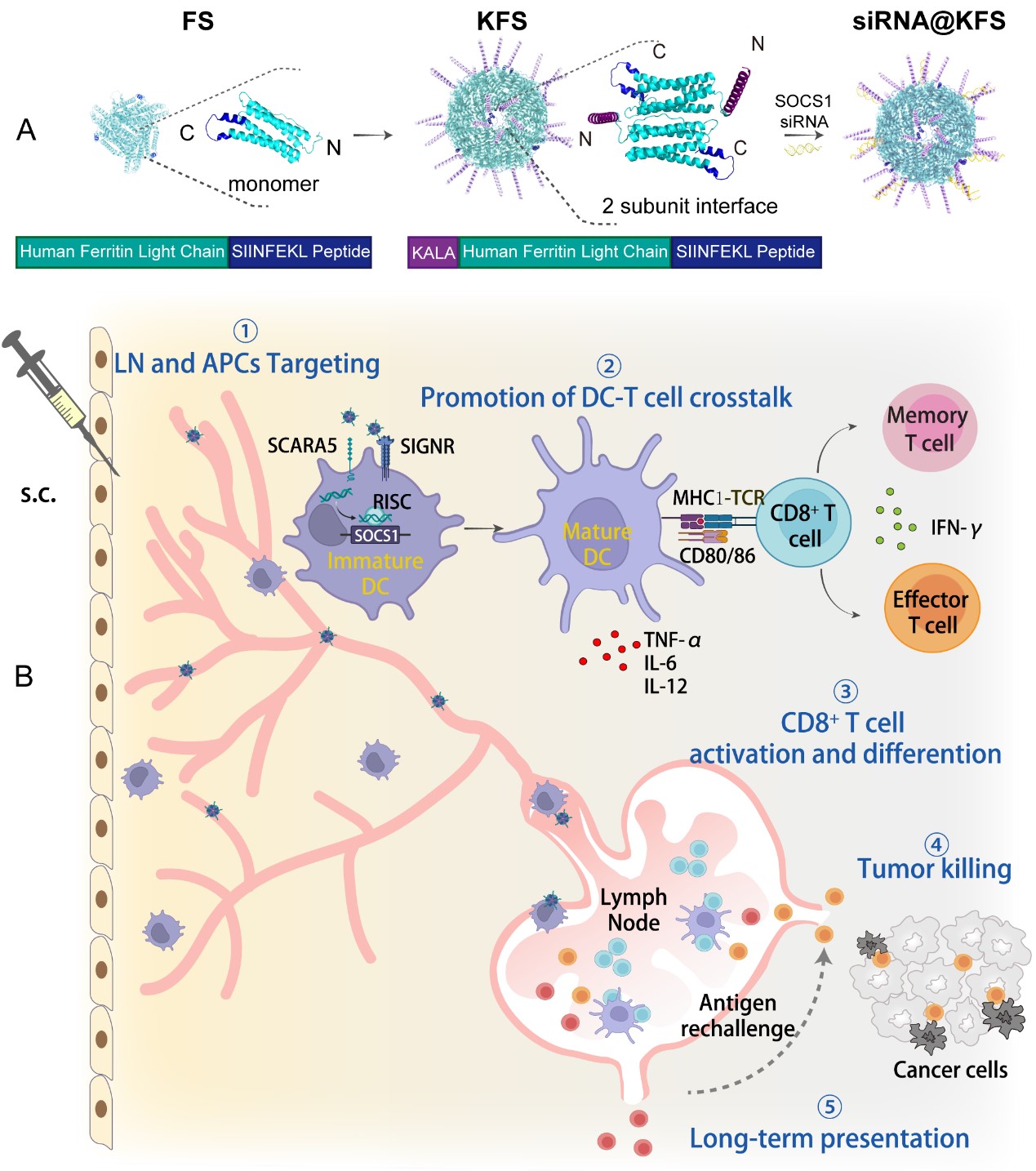 在国家重点研发计划(2021YFC2103100)、国家自然科学基金(22008090)等项目资助下,2138CC太阳集团陈敬华教授/张燕研究员团队在肿瘤免疫治疗领域取得了突破。研究成果以“Cancer vaccine designed from homologous ferritin-based fusion protein with enhanced DC-T cell crosstalk for durable adaptive immunity against tumors”为题于2025年1月在Bioactive Materials期刊上发表。该研究提出了一种创新的基于人铁蛋白轻链的纳米疫苗平台,成功实现了抗原和免疫调节siRNA的共递送,显著提升了肿瘤免疫反应。2138cc太阳集团博士研究生吴君为第一作者,陈敬华教授、张燕研究员为通讯作者。