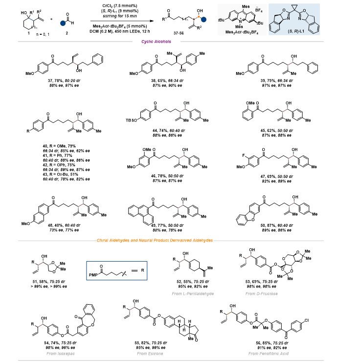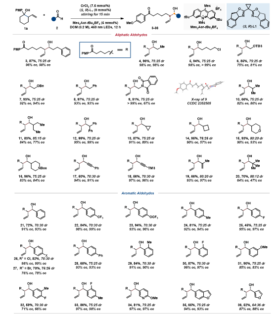 催化不对称合成在有机合成领域熠熠生辉,2001年化学诺贝尔奖授予了三位在手性催化合成领域做出杰出贡献的科学家(美国化学家诺尔斯博士和日本化学家野佐良治教授以及美国化学家沙普利斯教授)。在此,邹亮华课题组首次开发了一种非张力环醇开环不对称合成手性烯丙醇的策略。通过光氧化还原介导的质子偶联电子转移和手性铬催化,激活非张力环醇用于远端和位点特异性酮烯丙烷基化,成功实现了双手性中心的远端和位点特异性酮烯丙醇的不对称合成。这种新开发的双催化体系具有广泛的适用性,在温和的条件下进行,操作简单,并显示出对不同官能团极好的耐受性(如图1和图2),其策略也被应用于具有高对映选择性的复杂药物和天然产物衍生物的后期修饰。最后,通过机理研究提出了一种可能的反应机理(如图3)。可以预计,这种双手性催化平台将成为合成化学、药物发现和材料科学方面的一种很有价值的合成方法。