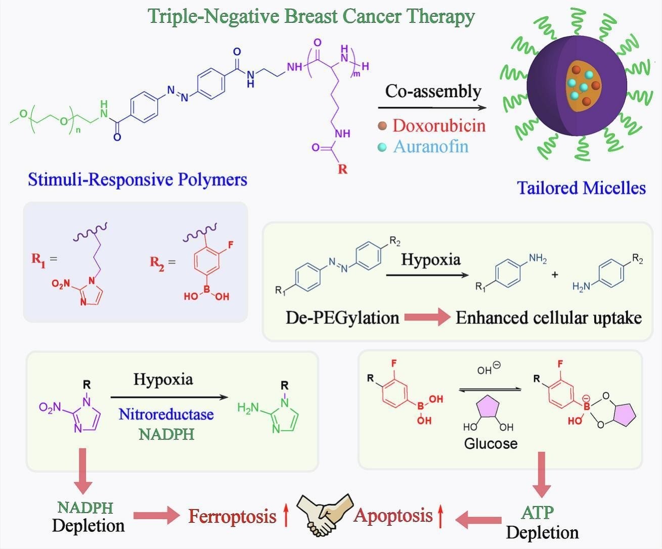 该研究针对肿瘤异质性导致的单一疗法局限性,开发了一种多功能刺激响应型聚合物胶束纳米平台,通过分子设计构建了双药共递送体系,并创新性地赋予载体材料自身调控肿瘤代谢微环境的能力。该纳米平台集成了三大功能模块:(1)偶氮苯基团通过缺氧响应断裂增强纳米粒与细胞膜相互作用从而提升内吞效率;(2)硝基咪唑作为缺氧响应单元,在肿瘤低氧微环境中触发药物释放并介导还原型辅酶Ⅱ(NADPH)耗竭;(3)3-氟苯硼酸通过葡萄糖依赖性反应降低ATP水平,形成代谢干预网络。三者协同作用打破肿瘤细胞防御机制,显著增强凋亡与铁死亡的协同效应。