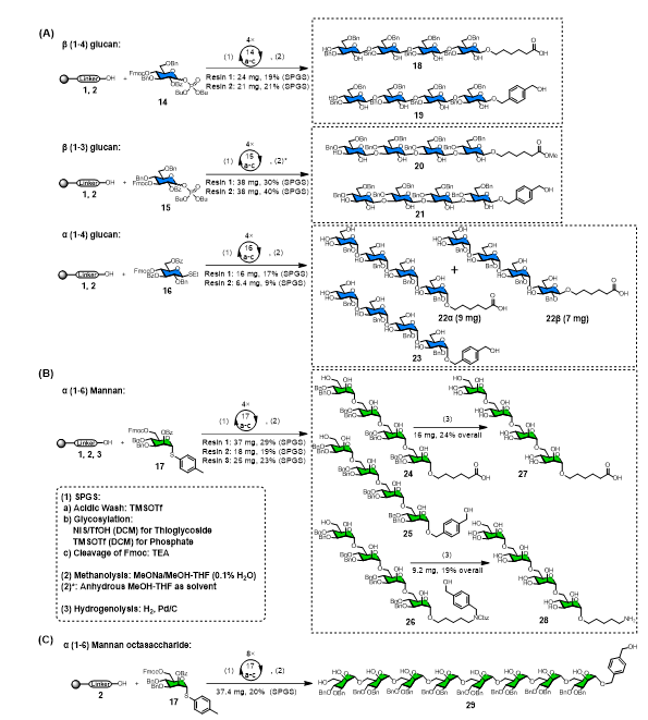 本研究采用上述三种新型连接臂以良好的产率成功构建了9种四糖和1种八糖,包括α-1,6-甘露聚糖、α-1,4-葡聚糖、β-1,4-葡聚糖和β-1,3-葡聚糖,充分验证了该连接臂系统在复杂聚糖组装中的普适性。其中,基础型未修饰寡糖为解析糖链结构与功能关系提供了理想模型,而具有多样化末端官能团的聚糖则为构建功能化糖缀合物开辟了新途径。这一进展不仅拓展了固相合成技术中连接臂的多样性,其高效的合成策略更展现出向自动化聚糖组装平台转化的巨大潜力,为糖化学研究及糖类药物开发提供了重要的技术支撑。
