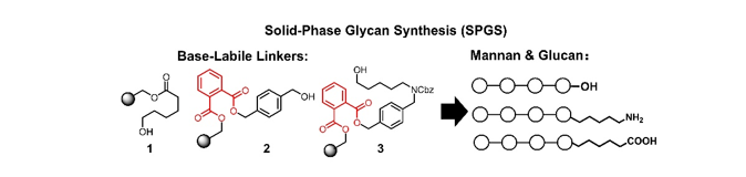 聚糖作为生命系统中的关键生物大分子,起着能量储存、结构支撑和信息传递等作用。由于其结构的高度复杂性和特异性,具有明确结构的聚糖主要通过化学、酶和化学酶合成获得。在众多合成技术中,固相合成法凭借其显著优势脱颖而出——该方法通过简单的溶剂洗涤即可实现每步糖基化及去保护后的纯化,避免了传统柱层析分离的繁琐操作。实现高效固相聚糖合成的核心要素在于合理选择结构单元与固相载体,其中连接固相载体与聚糖链的连接臂尤为关键。本研究设计并合成了三种适用于固相聚糖合成的新型碱基不稳定连接臂。这些新型连接臂不仅能够在聚糖还原末端引入氨基、羧基及自由还原末端多种功能基团,还具备差异化的裂解特性。其中两种含有邻苯二甲酸酯结构的连接臂不仅对甲醇钠敏感,还能在温和的肼解条件下实现裂解。通过肼解能够获得保留新戊酰酯保护的寡糖,与部分保护的聚糖相比纯化过程更加轻松。