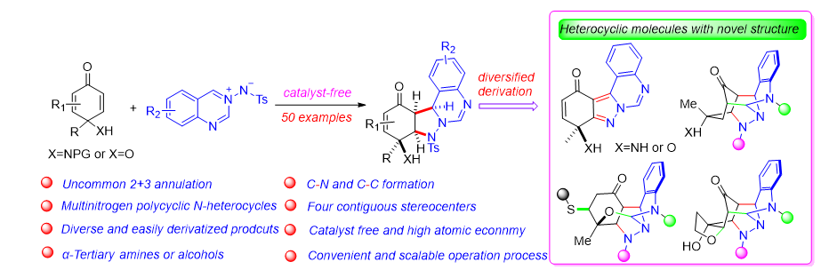 新药研发具有难度大、周期长的特点,而新分子实体(NMEs)结构多样性不足已成为药物开发的关键瓶颈之一。目前,现有化合物库中结构相似的分子占比过高,具有新颖骨架的化合物严重匮乏,难以满足现代药物筛选的高效需求。值得注意的是,含氮杂环作为药物化学中的优势骨架,在近十年获批的小分子药物中占比高达82%。然而,杂环结构的创新不足仍是新药研发中的核心科学问题之一。针对这一挑战,本研究开发了一种高效环化反应策略,利用4-氨基/羟基环己二烯酮与偶氮次甲基亚胺的精准转化,成功构建了结构新颖的四环吡唑烷类杂环化合物,显著拓展了杂环骨架的多样性。尤为突出的是,该方法合成的四环吡唑烷骨架可通过一步衍生化反应,进一步转化为结构复杂的类天然产物笼状杂环(含六个环及七个连续手性中心),充分展现了其在药物化学中的广阔应用前景。