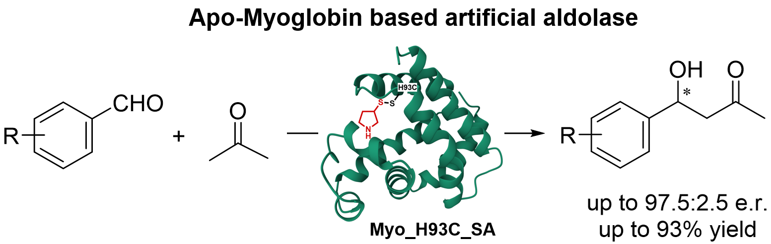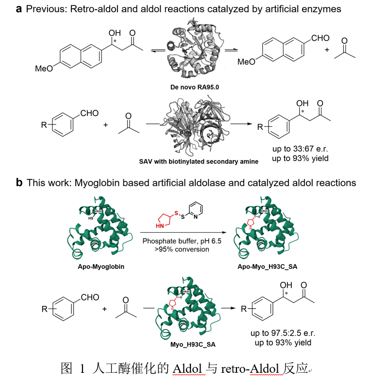 该研究展示了一种基于肌红蛋白的人工醛缩酶设计,通过将非天然的仲胺辅因子共价锚定在其口袋中作为酶的催化中心,从而有效催化碳-碳键的形成,构建手性羟基酮类化合物。通过策略性的半胱氨酸连接以及迭代式的定向进化,我们优化后的变体在丙酮以及多种醛类底物上均展现出出色的对映选择性。本研究不仅拓展了基于肌红蛋白的生物催化体系的应用范围,也展示了将非天然辅因子与蛋白质工程相结合以实现超越天然酶催化能力的潜力。未来的研究将聚焦于探索多种有机催化模式及替代性蛋白质支架,以推动在温和、环境友好的条件下实现酶催化非天然反应的发展。