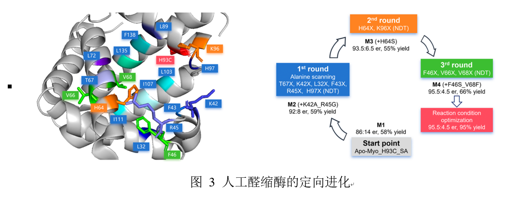 基于突变体Apo-Myo_H93C_SA所展现出的良好对映选择性和活性,我们采用了迭代式的定点定向突变策略来优化人工酶。我们根据肌红蛋白的晶体结构,通过丙氨酸扫描法研究了朝向腔体内且靠近位置93的残基,来评估他们在缩醛反应中的催化活性。后续通过分析氨基酸残基的位置以及大小,先后进行了四轮组合突变进化并优化了反应参数,并确定M4(Apo-Myo_H93C_K42A_R45G_H64S_F46S_V68F_SA)为最优突变体(其对映选择性为95.5:4.5,产率为95%)。