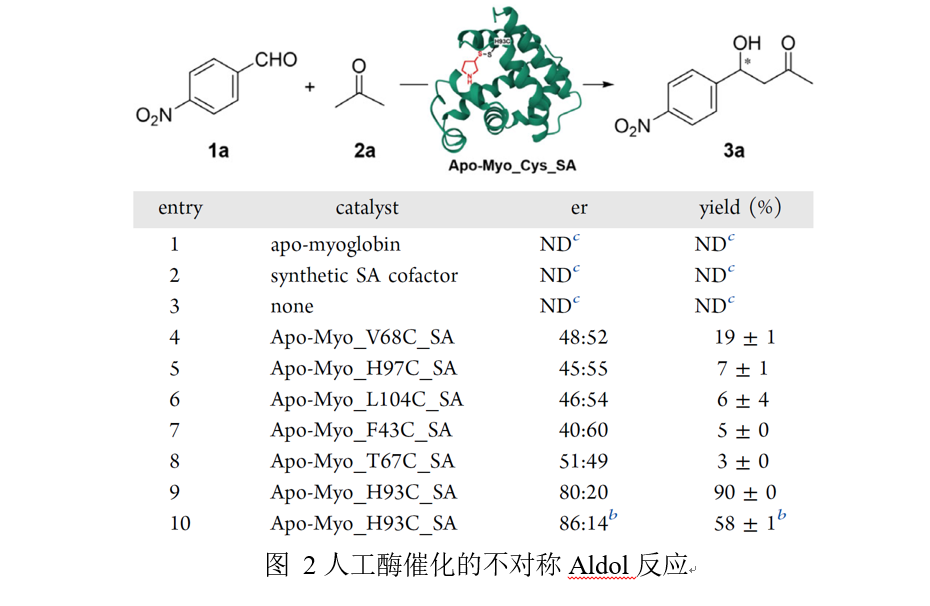 本研究中使用的肌红蛋白是一种由a螺旋血红素构成的小分子蛋白质,已被证明是一种极具多功能性的结构支架,可用于构建非天然活性。作者通过构建肌红蛋白变体,使其丧失天然结合血红素的能力,从而提供无辅基肌红蛋白骨架,随后在半胱氨酸残基上引入具有次级胺(SA)基团的合成辅因子构建出人工酶。基于肌红蛋白结构,作者选择了10个位置并将其突变为胱氨酸残基,以对合成的SA辅因子进行共价修饰,并且选择了丙酮与对硝基苯甲醛之间的缩醛反应作为研究的模型反应。经过筛选,有六种酶表现出可检测的对映选择性和催化活性,其中,Apo-Myo_H93C_SA显示出最高的反应活性和对映选择性,比例为80:20,产率为90%。此外,对反应条件的优化表明,降低温度和提高pH值能够提高对映选择性,其比例为86:14。