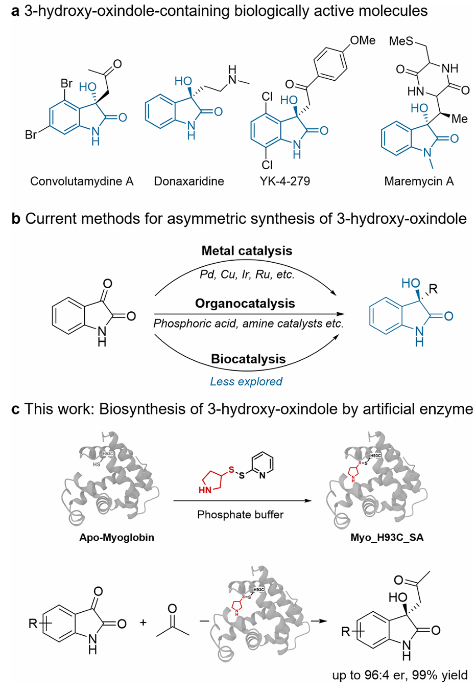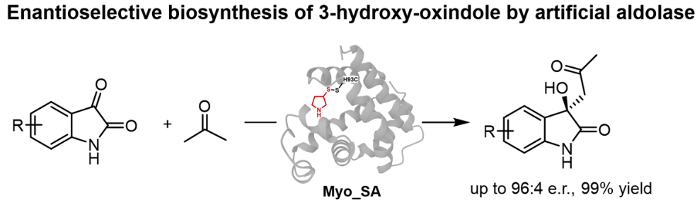 此研究开发了一种高效的生物催化途径,通过在肌红蛋白骨架apo-Myo中嵌入非天然催化位点的人工醛缩酶,实现立体选择性的3-羟基氧化吲哚化合物的生物合成。该人工醛缩酶通过将肌红蛋白与人工辅因子共价修饰而高效构建。人工醛缩酶的定向进化使得能够以优异的立体选择性和反应性生产多样化的手性3-羟基氧化吲哚。该工作不仅将人工醛缩酶的催化能力扩展至对药物相关吲哚醌骨架进行不对称组装,还展示了一种将设计型小分子催化剂嵌入蛋白骨架的一般策略——这一方法有望加速将创新化学纳入生物催化流程,从而实现多样化药物相关结构的合成。