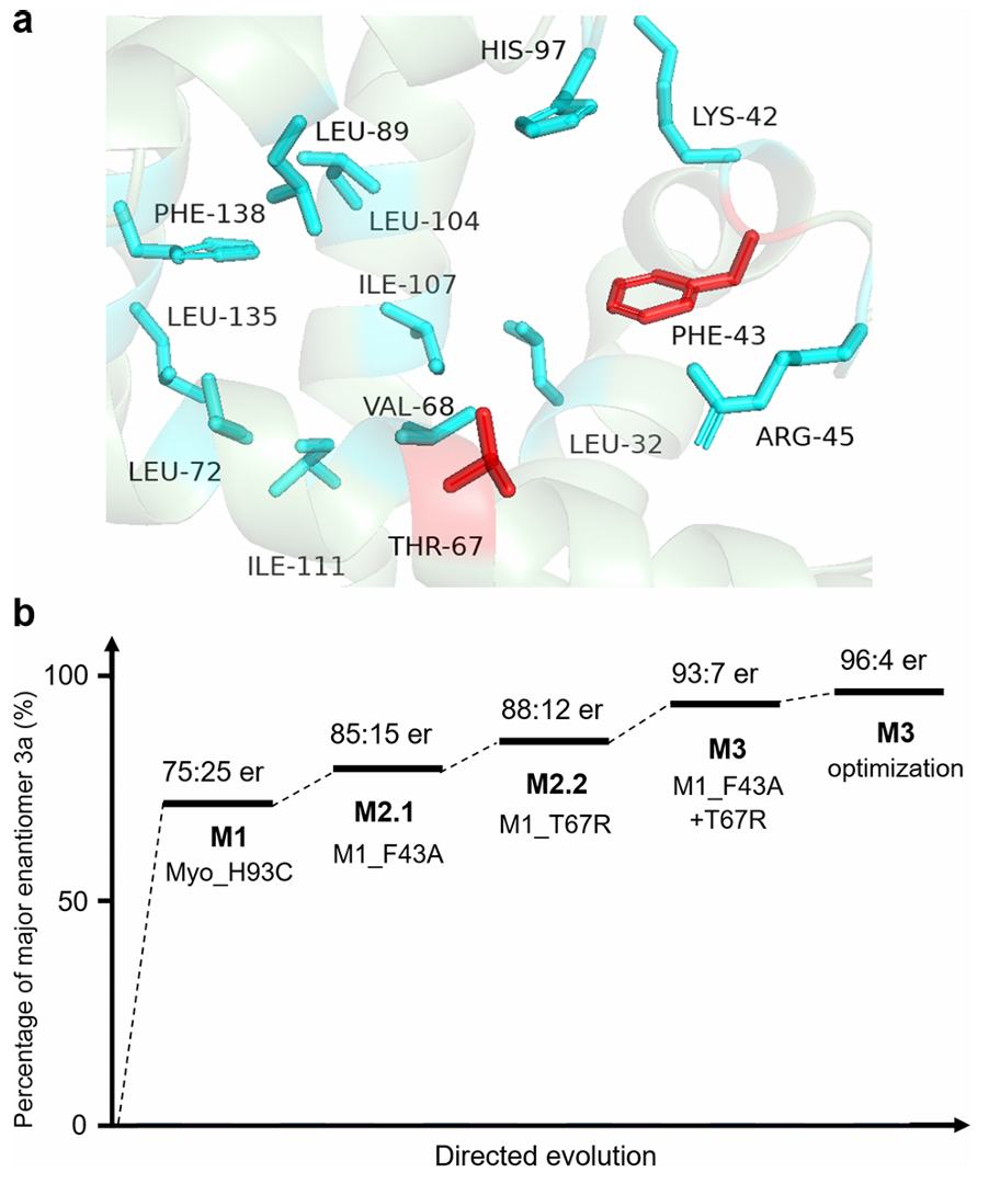 基于初步筛选成果,团队开启定向进化以提升人工酶对模板反应的立体选择性。作者首先通过丙氨酸扫描法研究朝向腔体内且靠近残基93的共计14个氨基酸残基,进行丙氨酸突变实验评估这些位点在缩醛反应中的重要性。7个残基被选中用于后续定向进化,此后作者进行了两轮组合突变进化并优化反应参数,并确定M3_SA(Apo-Myo_H93C_F43A_T67R_SA)为最优突变体(对映选择性为96:4,产率98%)。